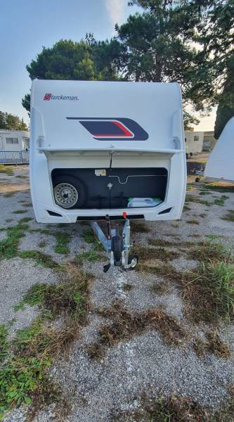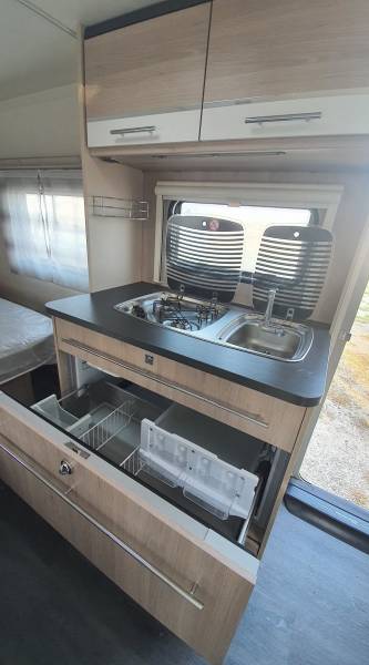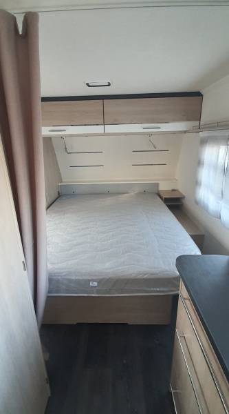 Caravane neuve collection 2021 STERCKEMAN STARLETT COMFORT 480CP tissu HANOI avec lit central (150 X 195) matelas « confort plus » en coutil ouatiné d’une épaisseur de 15 cm et salon en U transformable en lit d’appoint, c’est une 4 couchages. Coin toilette avec bac de propreté et WC à cassette, douche avec chauffe-eau 5 L TRUMA-THERME et douchette sur flexible. Réfrigérateur à tiroir XL FREEZE 150 L à compresseur, un combiné réchaud 3 feux et cuve inox avec couvercle verre. Elle possède une réserve d’eau propre fixe de 50 L.